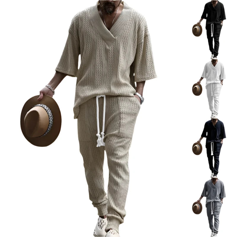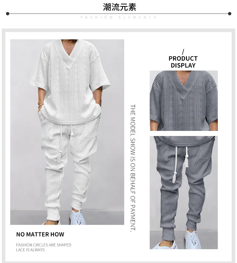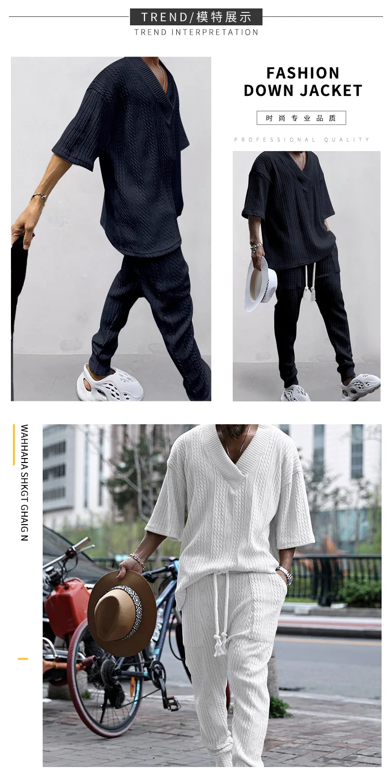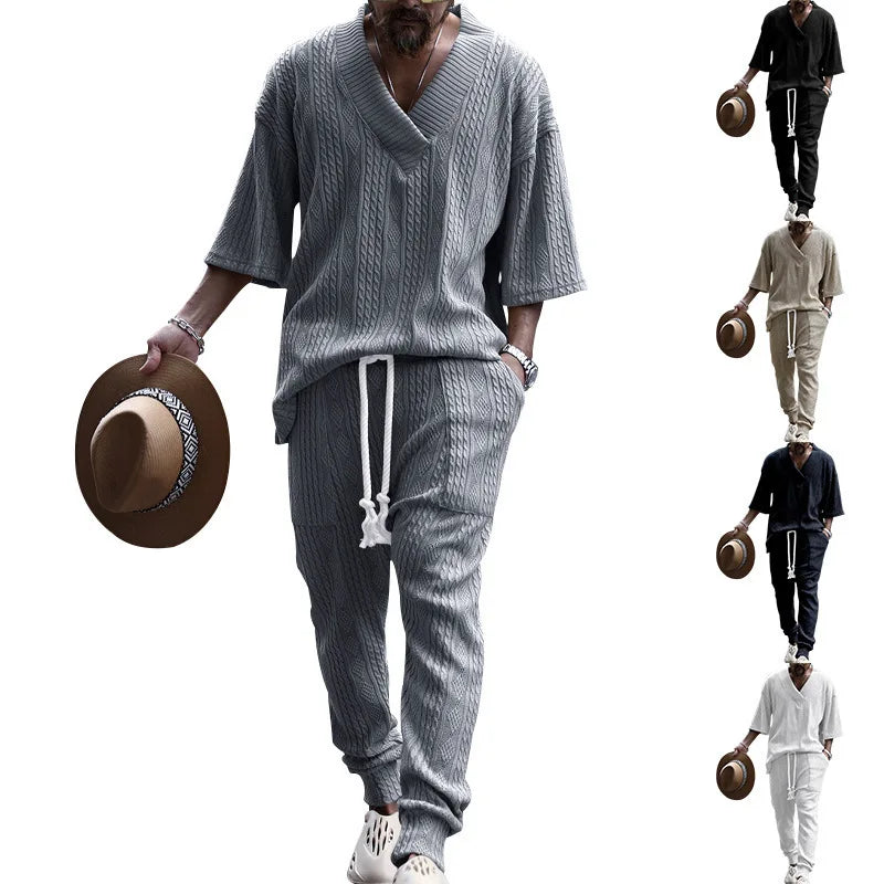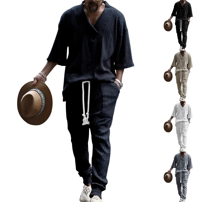 Men's Jacquard Knitwear Set, V-Neck Top and Pants