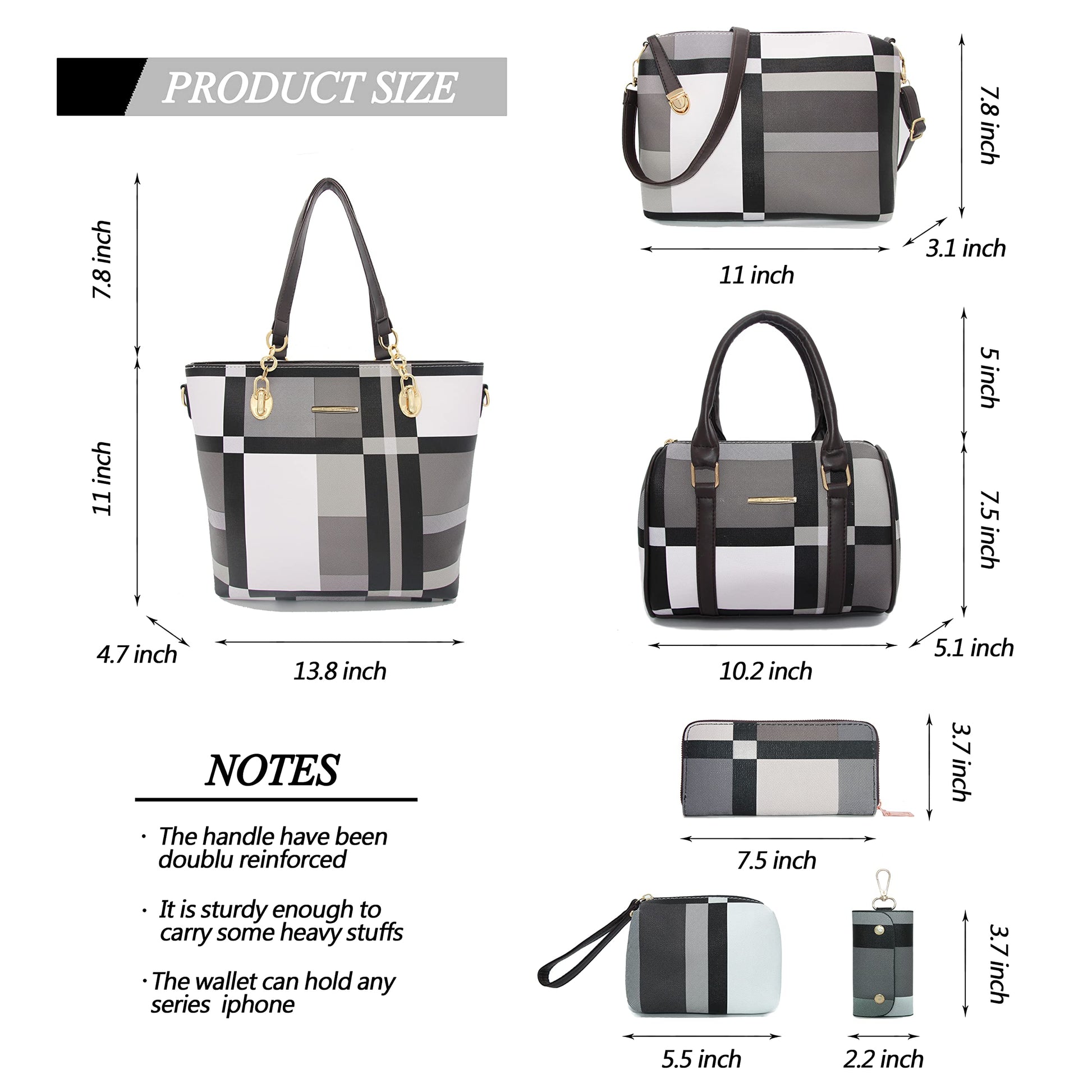- Dimensions of the 2E-youth women handbags 6pcs purse set: large tote bag:13.8"L x 4.7"W x 11"H,Handle height:7.8";middle tote bag:10.2"L x 5.1"W x 7.5"H;shoulder bag:11"L x 3.1"W x7.8"H;clutch:5.5"L x 3.7"H;purse:7.5"L x 3.7"H; key holder:2.2"L x 3.7"H.One separate adjustable strap length: 43".You can use 2E-youth purses together or individually. Suitable for use in every day.