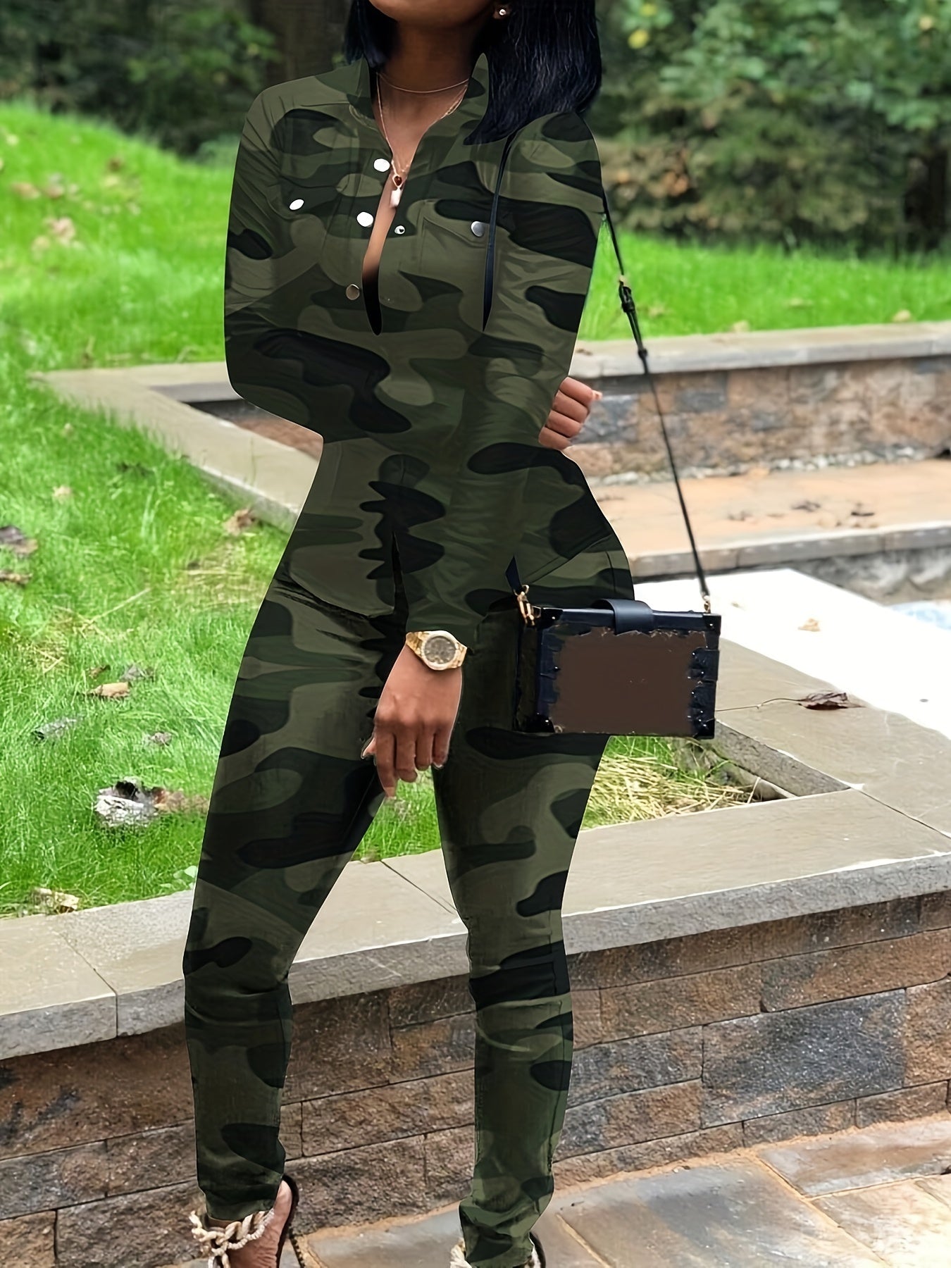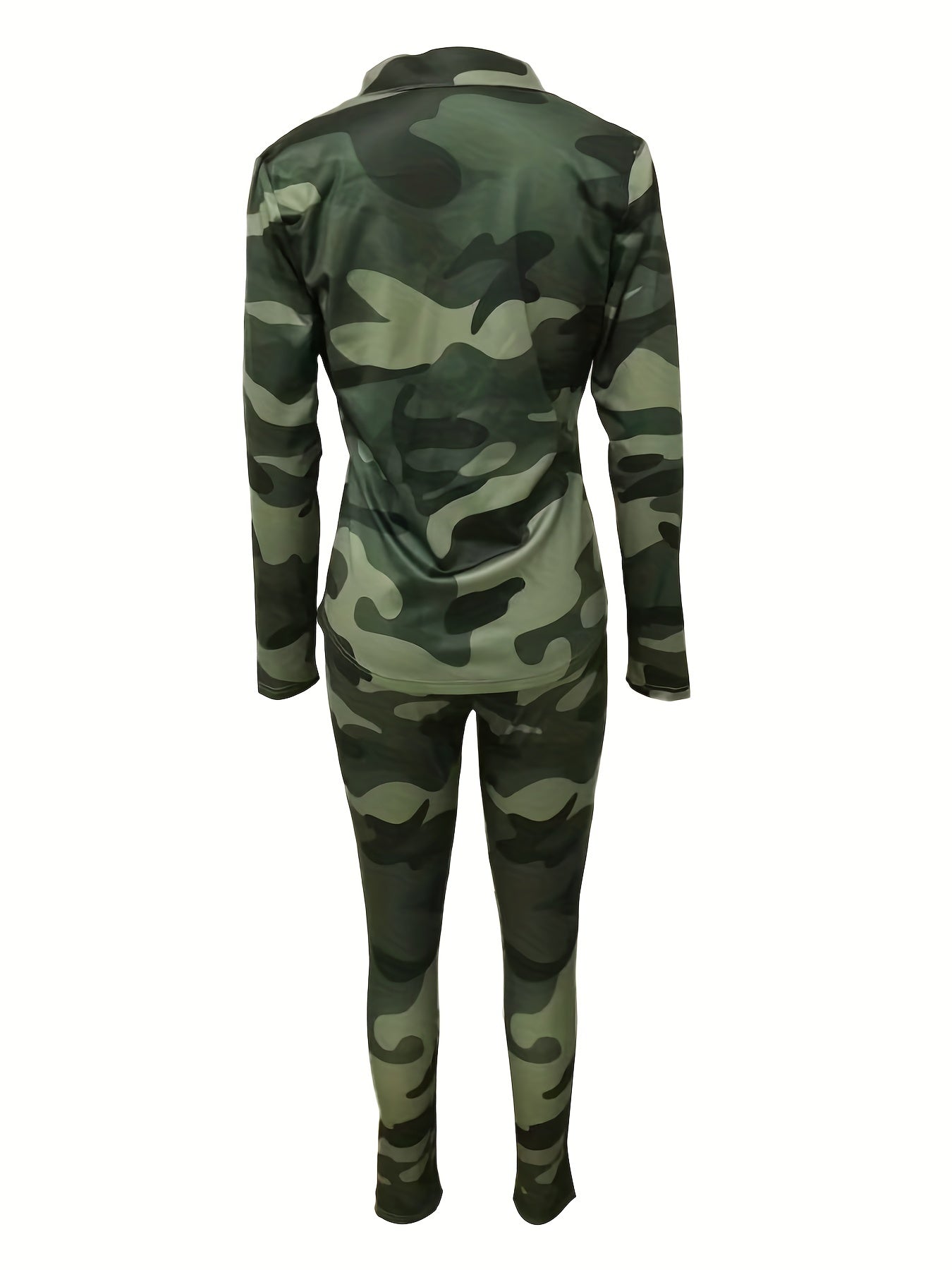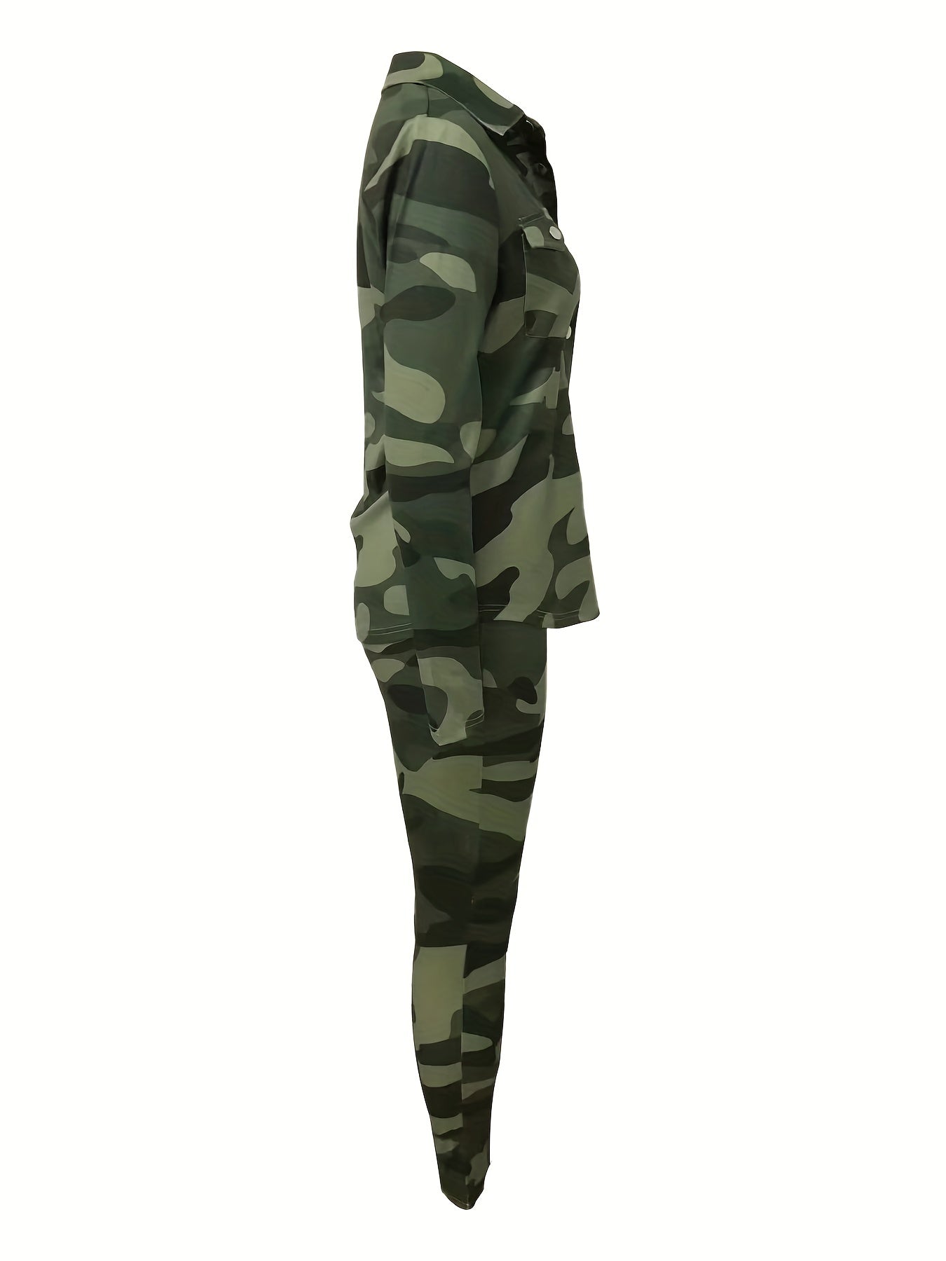 Camo Print Casual Two-piece Set, Button Front Long Sleeve Top & Slim Pants