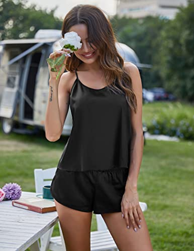 Women's Silk Camisole Nightwear Lingerie Set - Cami Top and Shorts (Black)