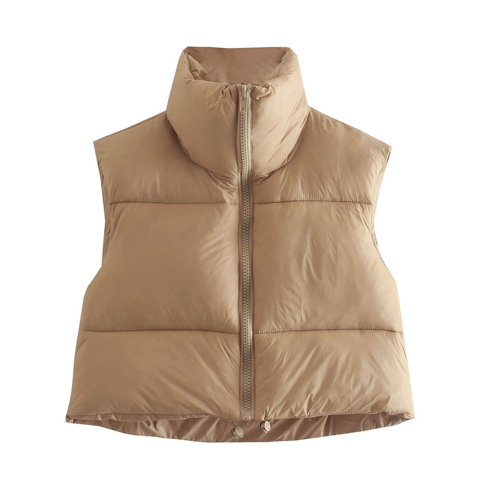 - Feature: Women's outerwear crop puffer vest, stand collar, sleeveless, elastic and adjustable drawstring hem, full zip, solid color, lightweight and warm, cropped puffer vest for women