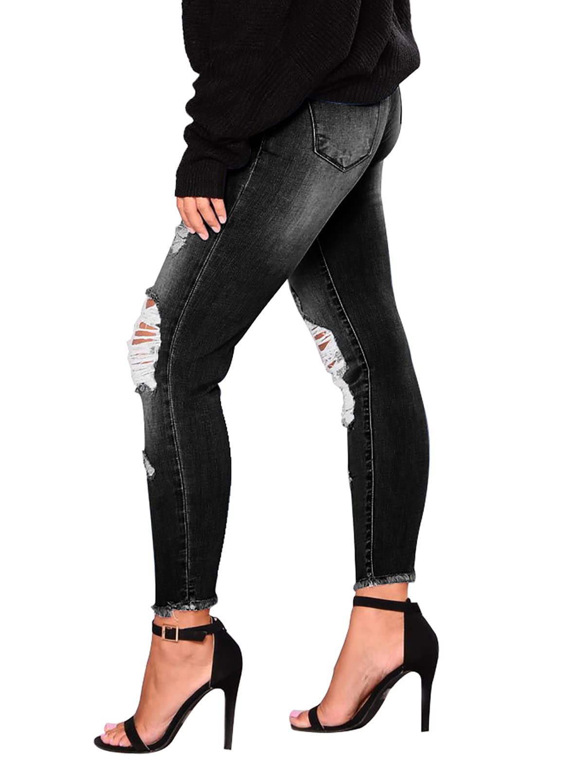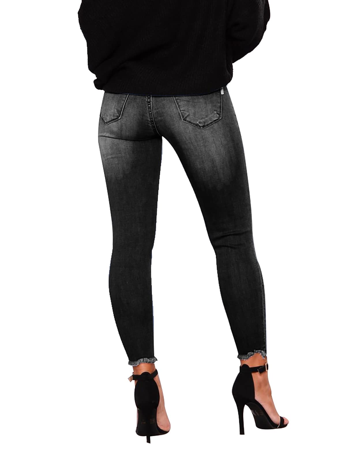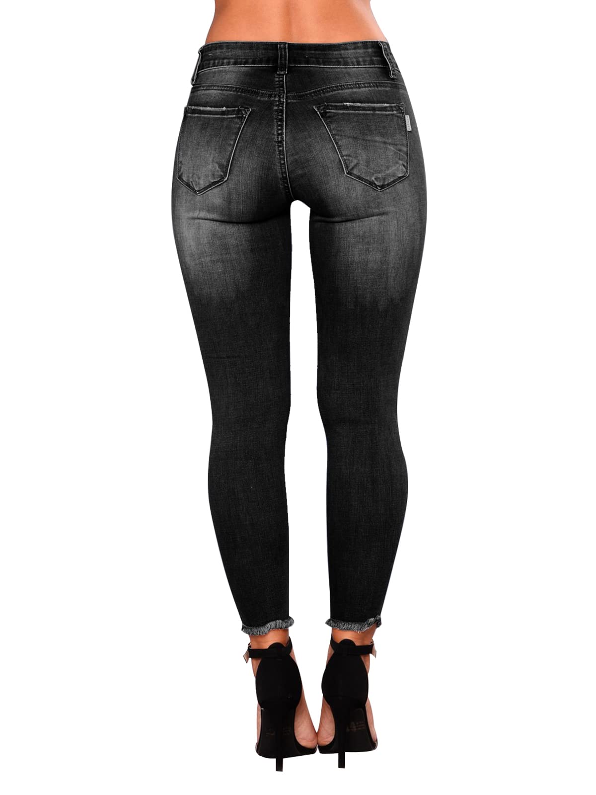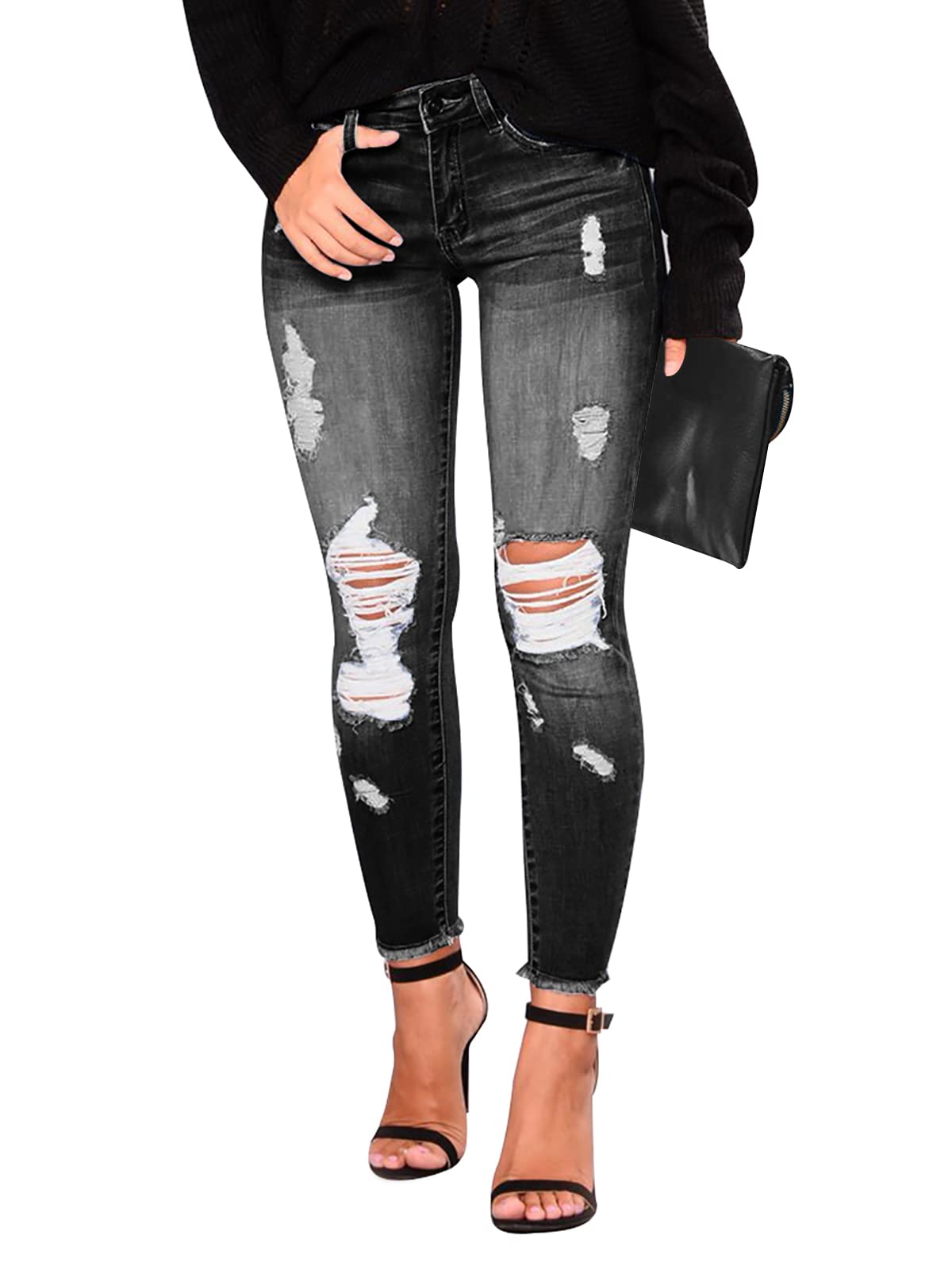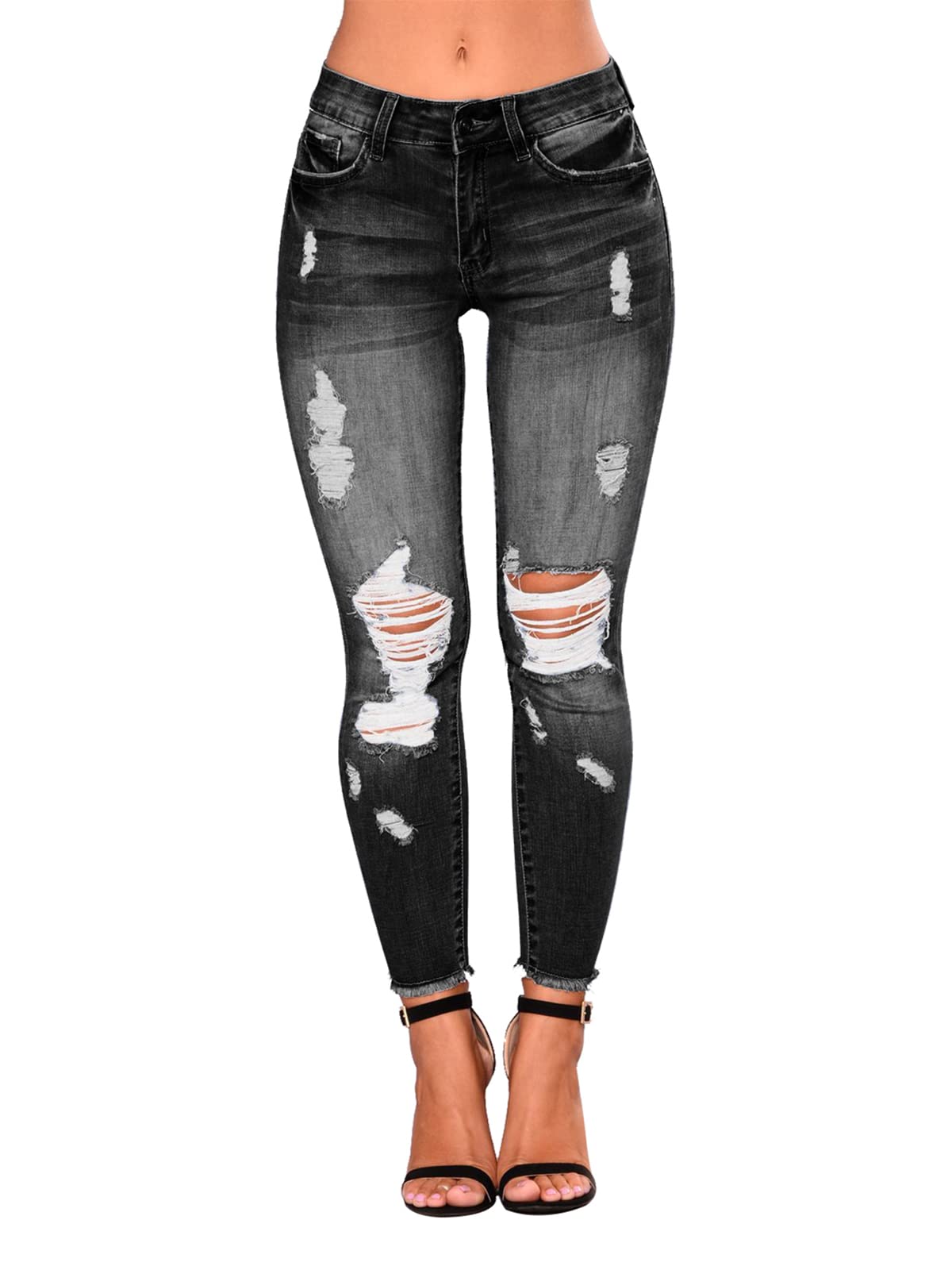 Women's Mid-Waist, Skinny Stretch, Ripped Jeans - Frayed, Distressed Denim