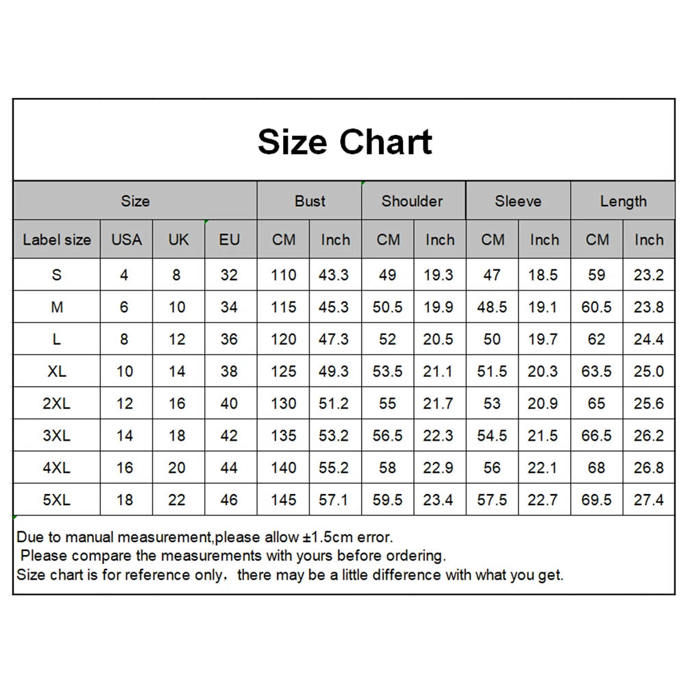 [Our Size 4XL] Bust: 140cm/55.2", Shoulder: 58cm/22.83", Sleeve: 56cm/22.05", Length: 68cm/26.77" (Approx.)